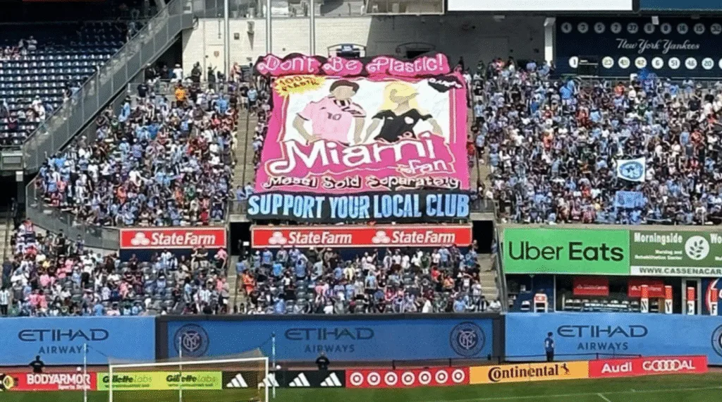 Tifo en un partido NYC – Miami de aficionados de la MLS que promueven la identificación de los clubes con sus comunidades locales. INDEPENDENT SUPPORTERS COUNCIL